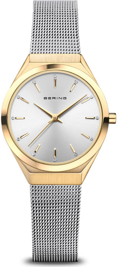 Zegarek damski 18729-010 marki Bering to stylowe połączenie funkcjonalności oraz ciekawego designu. Model ten w gamie pozostałych zegarków tego producenta występuje w kolekcji Bering Classic. Cyferblat zegarka jest w kolorze białym. Aktualna godzina przedstawiona jest w sposób analogowy co niezmiernie łatwo pozwala ją odczytać. Koperta jest w kolorze złotym szeroka jest na 29 mm oraz ma grubość 5 mm - ma okrągły kształt.