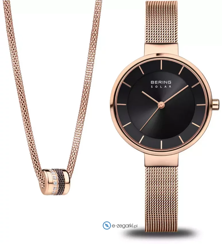 Zegarek damski 14631-362-SET marki Bering to harmonijne połączenie minimalistycznego designu i funkcjonalności. Ciekawy wygląd czasomierza uzyskano także dzięki tarczy w kolorze czarnym. Zegarek ten prezentuje godzinę w formacie analogowym dzięki czemu odczyt jest bezproblemowy. Koperta w barwach koloru różowo złotego szeroka jest na 31 mm oraz ma grubość 8 mm - posiada okrągły kształt. Jeśli poszukujesz czasomierza o skandynawskim charakterze, koniecznie sprawdź kolekcję Bering Solar.