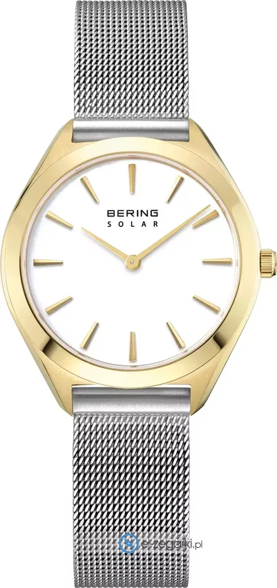 Zegarek 17331-010 marki Bering to gustowny zegarek naręczny damski, który posiada ciekawe rozwiązania i funkcje. Model ten występuje w serii Bering Solar. Charakter zapewnia wysokiej jakości cyferblat w kolorze białym. Zaprezentowana metodą analogową bieżąca godzina jest czytelna i łatwa do odczytania. Koperta została pokryta kolorem złotym szeroka jest na 31 mm - w kształcie okrągłym.