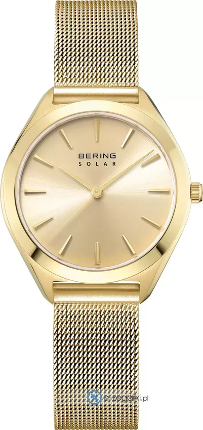 Zegarek damski 17331-333 marki Bering to stylowe połączenie funkcjonalności a także modnego wzornictwa. Model ten w gamie innych zegarków tego producenta występuje w serii Bering Solar. Wysokiej trwałości cyferblat zegarka pokryto złotym kolorem. Pokazana metodą analogową bieżąca godzina jest czytelna i łatwa do odczytania. Koperta w barwach koloru złotego szeroka jest na 31 mm - posiada okrągły kształt.