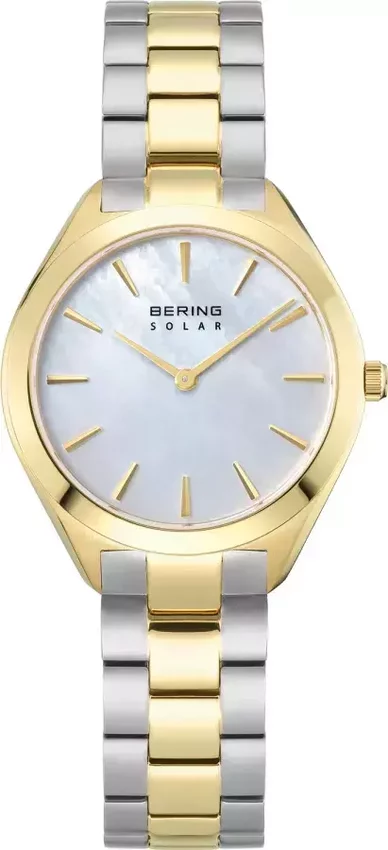 Zegarek 17331-710 marki Bering to elegancki zegarek naręczny damski, który wyposażono w ciekawe rozwiązania i funkcje. Model ten należy do kolekcji Bering Solar. Niestereotypowy wygląd zegarka osiągnięto m.in. poprzez tarczę w kolorze perłowym. Zegarek ten pokazuje godzinę w formacie analogowym dzięki temu odczyt jest bardzo łatwy. Koperta jest pokryta kolorem złotym szeroka jest na 31 mm - w kształcie okrągłym.