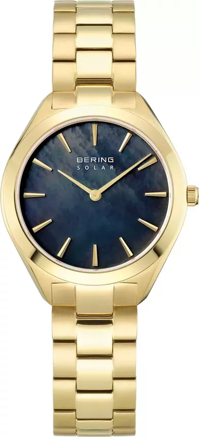 Zegarek damski 17331-732 marki Bering to dobre połączenie funkcjonalności a także modnego designu. Model ten należy do serii Bering Solar. Wysokiej trwałości cyferblat zegarka pokryto czarnym kolorem. Zegarek ten pokazuje godzinę w formacie analogowym dzięki temu odczyt jest bardzo łatwy. Koperta jest pokryta kolorem złotym szeroka jest na 31 mm - w kształcie okrągłym.
