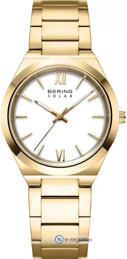 Zegarek damski 19932-734 marki Bering to dobre połączenie funkcjonalności a także modnego wzornictwa. Model ten w gamie innych zegarków tego producenta występuje w kolekcji Bering Solar. Cyferblat zegarka jest w kolorze białym. Zegarek ten pokazuje godzinę w formacie analogowym dzięki temu odczyt jest bardzo łatwy. Koperta jest w kolorze złotym szeroka jest na 32 mm oraz ma grubość 7 mm - ma okrągły kształt.