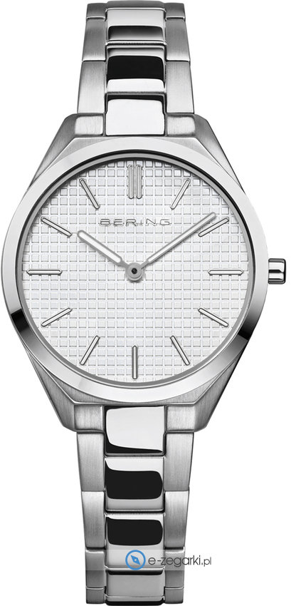 Zegarek damski 17231-700 marki Bering to idealne połączenie funkcjonalności oraz modnego wzornictwa. Model ten w gamie pozostałych zegarków tego producenta występuje w kolekcji Bering Ultra Slim. Atrakcyjną budowę czasomierza osiągnięto z pomocą tarczy w kolorze białym. Pokazana metodą analogową aktualna godzina jest czytelna i szybka do sprawdzenia. Koperta jest w kolorze srebrnym szeroka jest na 31 mm oraz ma grubość 5 mm - charakteryzuje się okrągłym kształtem.