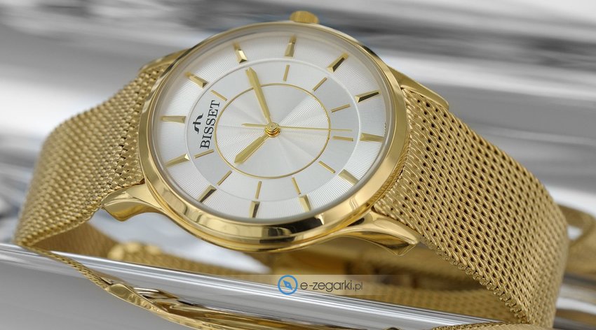 Damski zegarek Bisset BSBD63GISX03BX to zegarek, który dzięki swemu wzornictwu zawsze będzie prezentował się dobrze. Charakter zapewnia wysokiej klasy cyferblat w kolorze srebrnym. Koperta jest w kolorze złotym szeroka jest na 36 mm oraz ma grubość 8 mm - w kształcie okrągłym.