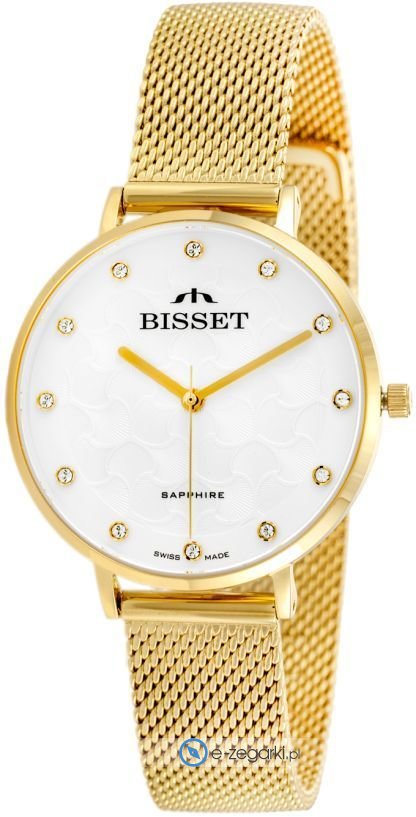 Zegarek damski BSBF32GISX03B1 marki Bisset to dobra pozycja dla osób ceniących sobie dbałość o szczegóły jak również bezproblemowe funkcjonowanie mechanizmów. Niebanalną stylistykę zegarka uzyskano z pomocą tarczy w kolorze białym. Aktualna godzina pokazywana jest w sposób analogowy co bez trudu pozwala ją odczytać. Koperta jest w kolorze złotym szeroka jest na 32 mm oraz ma grubość 7 mm - w kształcie okrągłym.