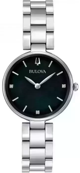 Model 96P204 marki Bulova to elegancki zegarek naręczny damski, który wyposażono w pomysłowe rozwiązania i funkcje. Cyferblat zegarka jest w kolorze czarnym. Pokazana metodą analogową aktualna godzina jest czytelna i łatwa do sprawdzenia. Koperta w barwach koloru srebrnego szeroka jest na 27 mm oraz ma grubość 7 mm - posiada okrągły kształt.