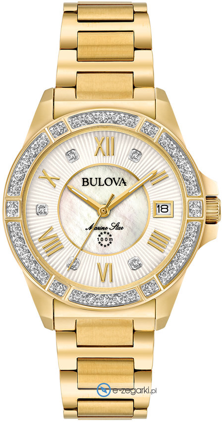 Model 98R235 marki Bulova to stylowy zegarek naręczny damski, który wyposażono w pomysłowe rozwiązania i funkcje. Stylu nadaje wysokiej jakości tarcza w kolorze białym. Pokazana metodą analogową bieżąca godzina jest czytelna i prosta do odczytania. Koperta jest w kolorze złotym szeroka jest na 32 mm oraz ma grubość 10 mm - ma okrągły kształt.