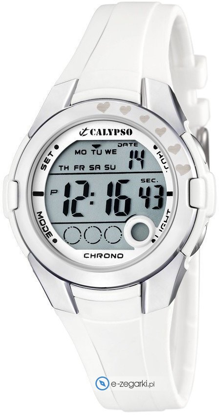 Model K5571-1 marki Calypso to elegancki zegarek naręczny damski, który posiada ciekawe rozwiązania oraz funkcje. Niebanalny wygląd czasomierza osiągnięto m.in. poprzez cyferblat w kolorze białym. Zegarek ten prezentuje godzinę w formacie cyfrowym dzięki temu odczyt jest intuicyjny. Koperta szeroka jest na 37 mm - cechuje się okrągłym kształtem.