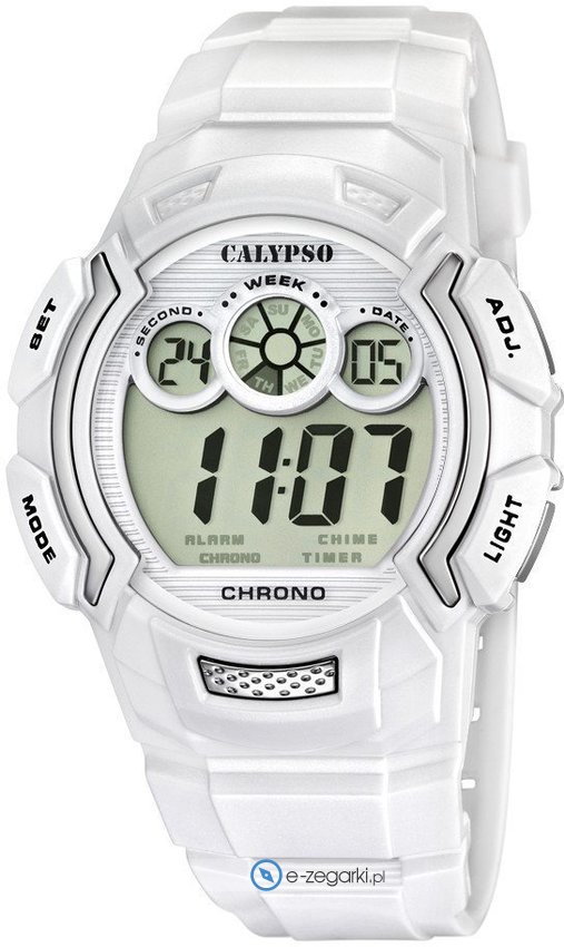 Zegarek damski K5592-1 marki Calypso to dobre połączenie funkcjonalności i modnego wzornictwa. Charakteru nadaje wysokiej jakości tarcza w kolorze białym. Godzina pokazywana jest w sposób cyfrowy co intuicyjnie pozwala ją odczytać. Koperta szeroka jest na 45 mm - posiada okrągły kształt.
