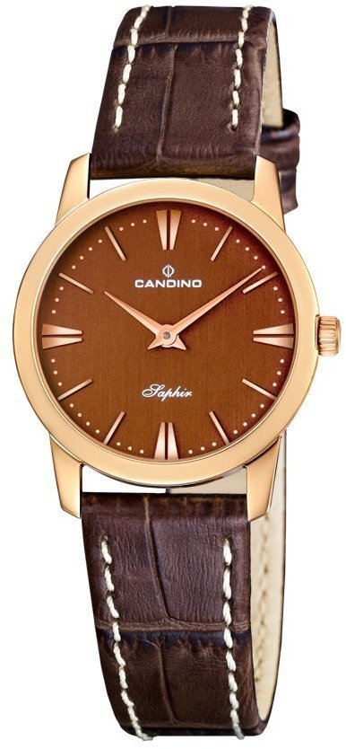Zegarek damski C4413-5 marki Candino to ciekawa pozycja dla osób ceniących sobie dbałość o szczegóły jak również bezawaryjne zachowanie mechanizmów. Ciekawy wygląd zegarka osiągnięto m.in. poprzez cyferblat w kolorze brązowym. Zaprezentowana metodą analogową bieżąca godzina jest czytelna i szybka do odczytania.