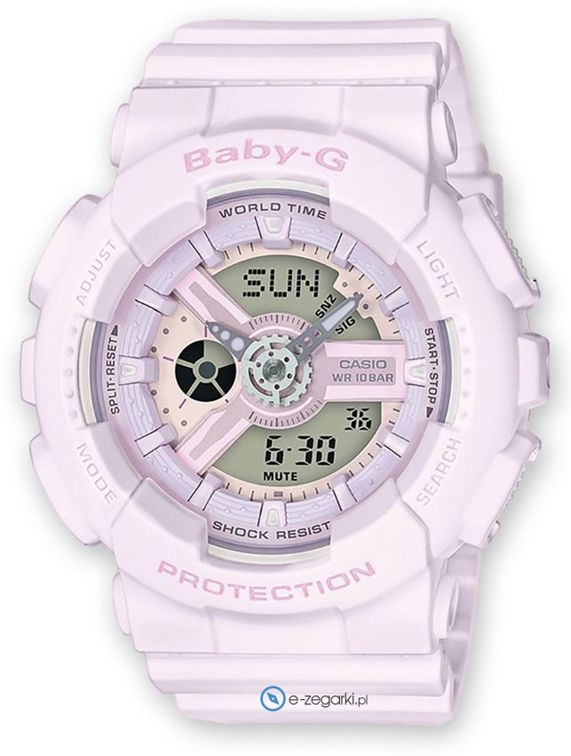 Damski zegarek BA-110-4A2ER z kolekcji Casio Baby-G marki Casio to połączenie stylu i nieprzeciętnych mechanizmów. Pokazana metodą analogowo - cyfrową bieżąca godzina jest czytelna i szybka do odczytania. Koperta jest w kolorze różowym szeroka jest na 43 mm oraz ma grubość 15 mm - posiada okrągły kształt.