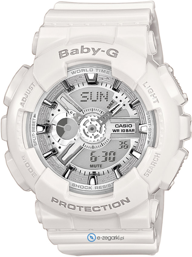 Zegarek damski BA-110-7A3ER marki Casio to dobre połączenie funkcjonalności oraz modnego wzornictwa. Model ten pochodzi z serii Casio Baby-G. Ciekawą stylistykę czasomierza uzyskano z pomocą tarczy w kolorze białym. Pokazana metodą analogowo - cyfrową bieżąca godzina jest czytelna i prosta do odczytania. Koperta w odcieniach koloru białego szeroka jest na 43 mm oraz ma grubość 15 mm - w kształcie okrągłym.