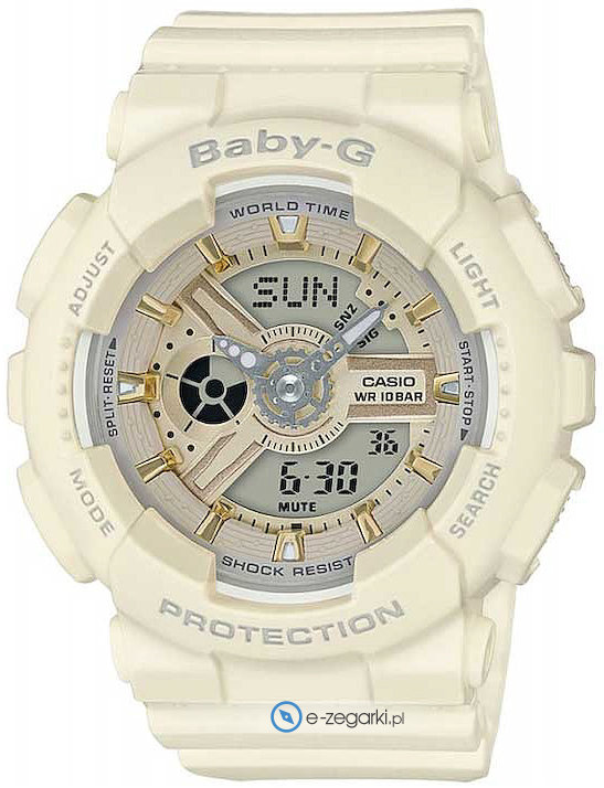Model damski BA-110GA-7A2ER marki Casio z rodziny Casio Baby-G. Zegarek ten prezentuje aktualny czas w formacie analogowo - cyfrowym dzięki czemu odczyt jest bezproblemowy. Koperta szeroka jest na 43 mm oraz ma grubość 14 mm.