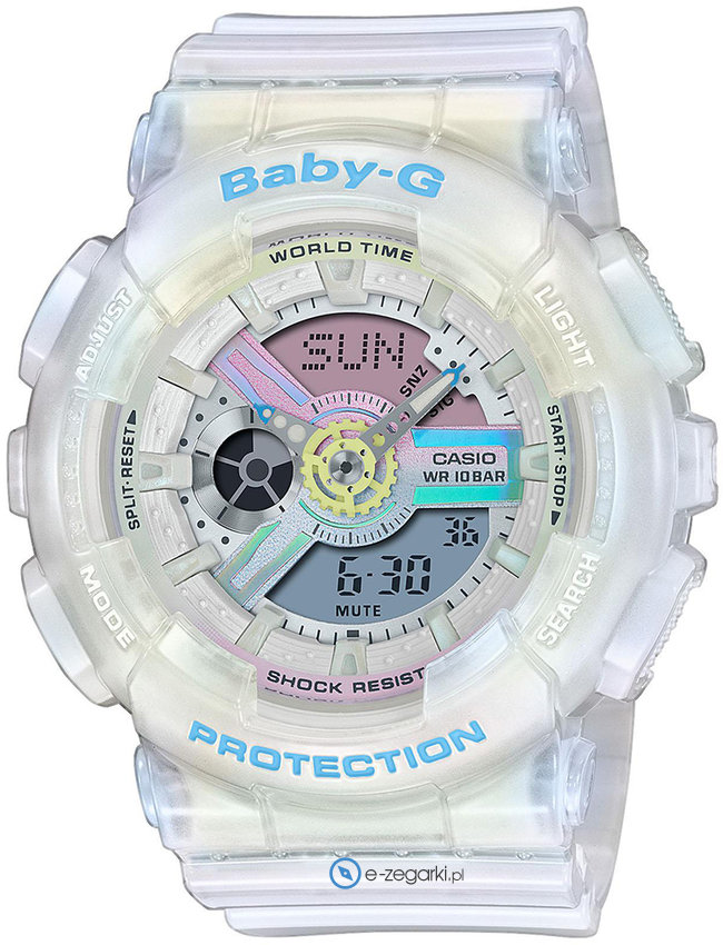 Damski zegarek BA-110PL-7A2ER z serii Casio Baby-G marki Casio to połączenie estetyki oraz ciekawych funkcji. Zegarek ten prezentuje aktualny czas w formacie analogowo - cyfrowym dzięki temu odczyt jest intuicyjny. Koperta szeroka jest na 43 mm oraz ma grubość 16 mm - w kształcie okrągłym.