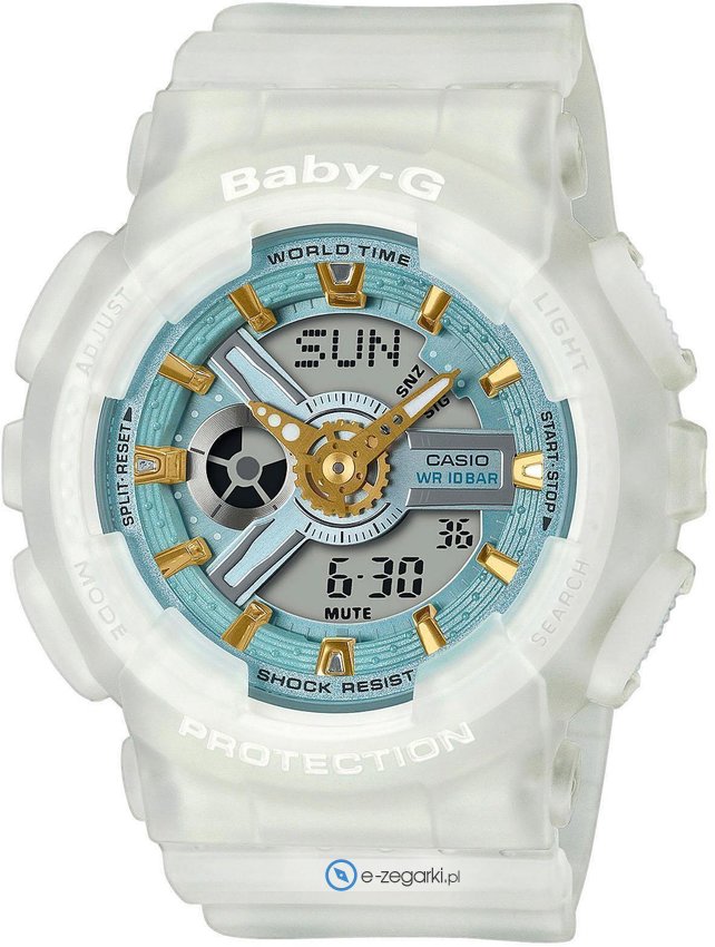 Damski zegarek BA-110SC-7AER z kolekcji Casio Baby-G marki Casio to połączenie estetyki oraz ciekawych funkcji. Charakterystyczny wygląd czasomierza uzyskano m.in. poprzez cyferblat w kolorze niebieskim. Aktualna godzina pokazywana jest w sposób analogowo - cyfrowy co niezmiernie łatwo pozwala ją odczytać. Koperta została ozdobiona kolorem białym szeroka jest na 43.4 mm oraz ma grubość 15.8 mm - w kształcie okrągłym.