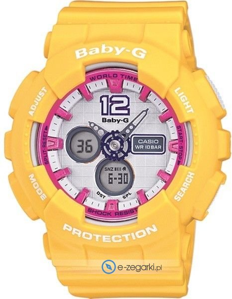 Zegarek damski BA-120-9BER marki Casio należy do kolekcji Casio Baby-G. Cyferblat zegarka w kolorze białym. Zegarek ten prezentuje aktualny czas w formacie analogowo - cyfrowym dzięki czemu odczyt jest bardzo łatwy. Koperta w odcieniach koloru zółtego szeroka jest na 43 mm oraz ma grubość 15 mm - w kształcie okrągłym.