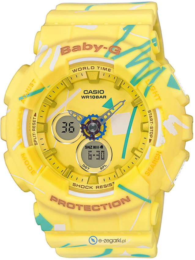 Zegarek damski BA-120SC-9AER marki Casio z serii Casio Baby-G. Godzina zaprezentowana jest w sposób analogowo - cyfrowy co intuicyjnie pozwala ją odczytać. Koperta szeroka jest na 46 mm oraz ma grubość 16 mm - w kształcie okrągłym.