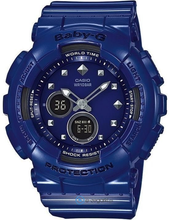 Zegarek BA-125-2AER marki Casio to elegancki zegarek naręczny damski, który jest wyposażony w pomysłowe rozwiązania oraz funkcje. Model ten należy do serii Casio Baby-G. Ciekawy wygląd zegarka osiągnięto również dzięki tarczy w kolorze niebieskim. Zaprezentowana metodą analogowo - cyfrową aktualna godzina jest czytelna i prosta do sprawdzenia. Koperta jest pokryta kolorem niebieskim szeroka jest na 43 mm oraz ma grubość 16 mm - w kształcie okrągłym.