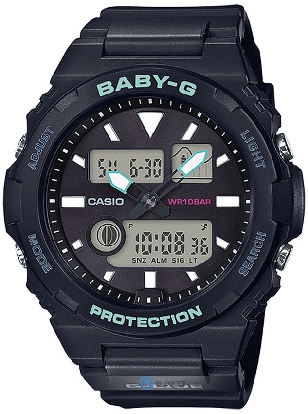 Damski zegarek BAX-100-1AER z serii Casio Baby-G marki Casio to połączenie estetyki oraz nieprzeciętnych mechanizmów. Aktualna godzina prezentowana jest w sposób analogowo - cyfrowy co niezmiernie łatwo pozwala ją odczytać. Koperta szeroka jest na 42.4 mm oraz ma grubość 11 mm.