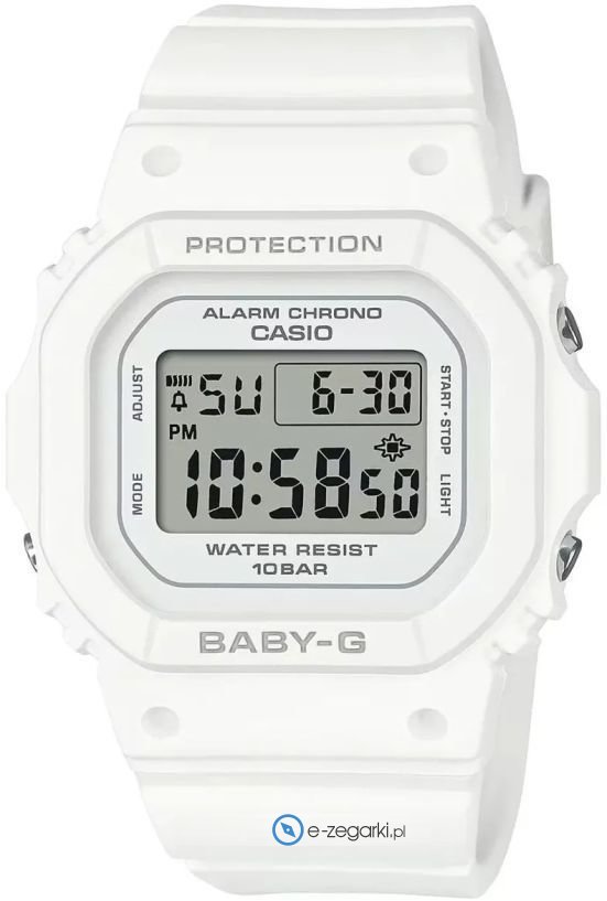 Zegarek BGD-565U-7ER marki Casio to elegancki zegarek naręczny damski, który jest wyposażony w ciekawe rozwiązania i funkcje. Model ten zalicza się do serii Casio Baby-G. Cyferblat zegarka jest w kolorze białym. Aktualna godzina przedstawiona jest w sposób cyfrowy co niezmiernie łatwo pozwala ją odczytać. Koperta jest w kolorze białym szeroka jest na 38 mm oraz ma grubość 11 mm - charakteryzuje się prostokątnym kształtem.
