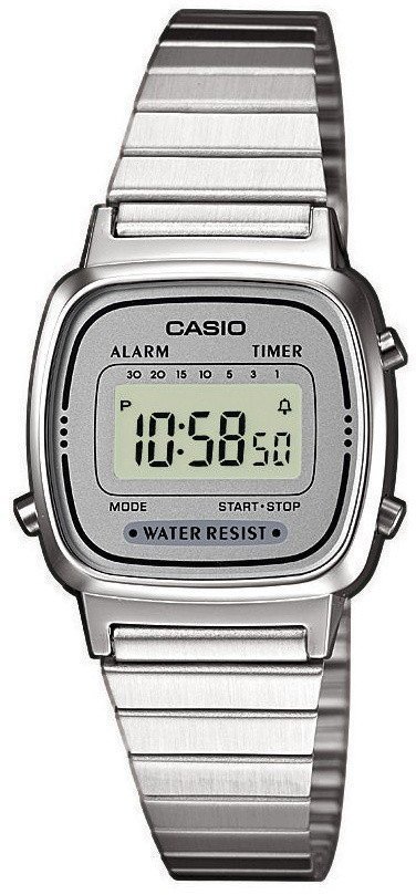 Zegarek LA670WEA-7EF marki Casio to elegancki zegarek naręczny damski, który wyposażono w pomysłowe rozwiązania oraz funkcje. Model ten występuje w kolekcji Casio Collection. Cyferblat zegarka jest w kolorze szarym. Godzina prezentowana jest w sposób cyfrowy co intuicyjnie pozwala ją odczytać. Koperta szeroka jest na 24.6 mm oraz ma grubość 8 mm - posiada prostokątny kształt.