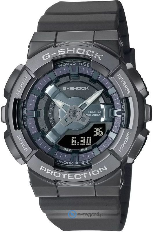 Zegarek GM-S110B-8AER posiada kwarcowy mechanizm zasilany tradycyjną baterią. Pasek jest w kolorze szarym wykonany jest z wysokiej jakości tworzywa sztucznego.