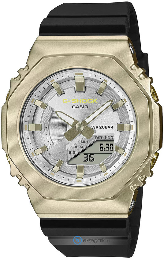 Zegarek damski GM-S2100BC-1AER należy do kolekcji Casio G-Shock marki Casio. Charakteru dodaje wysokiej jakości tarcza w kolorze srebrnym. Pokazana metodą analogowo - cyfrową bieżąca godzina jest czytelna i prosta do sprawdzenia. Koperta jest ozdobiona kolorem złotym szeroka jest na 40 mm oraz ma grubość 11 mm - charakteryzuje się okrągłym kształtem.