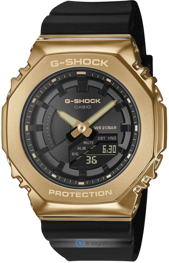 Zegarek GM-S2100GB-1AER marki Casio to elegancki zegarek naręczny damski, który wyposażono w pomysłowe rozwiązania oraz funkcje. Model ten występuje w kolekcji Casio G-Shock. Ciekawy wygląd czasomierza osiągnięto m.in. poprzez tarczę w kolorze czarnym. Pokazana metodą analogowo - cyfrową aktualna godzina jest czytelna i łatwa do sprawdzenia. Koperta została pokryta kolorem złotym szeroka jest na 40 mm oraz ma grubość 11 mm - wyróżnia się okrągłym kształtem.
