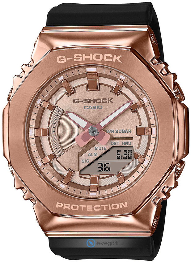 Zegarek damski GM-S2100PG-1A4ER marki Casio to dobre połączenie funkcjonalności a także modnego designu. Model ten w gamie pozostałych zegarków tego producenta występuje w serii Casio G-Shock. Nieschematyczny wygląd zegarka uzyskano również dzięki tarczy w kolorze różowo złotym. Godzina zaprezentowana jest w sposób analogowo - cyfrowy co niezmiernie łatwo pozwala ją odczytać. Koperta szeroka jest na 40 mm oraz ma grubość 11 mm - w kształcie okrągłym.