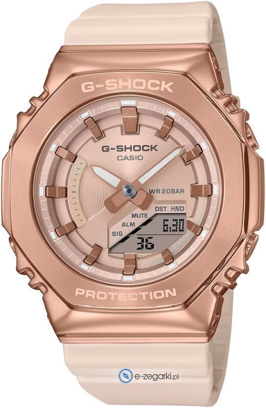 Zegarek damski GM-S2100PG-4AER marki Casio to dobre połączenie funkcjonalności i modnego wzornictwa. Model ten w gamie pozostałych zegarków tego producenta występuje w kolekcji Casio G-Shock. Tarcza zegarka jest w kolorze różowo złotym. Zegarek ten pokazuje godzinę w formacie analogowo - cyfrowym dzięki temu odczyt jest intuicyjny. Koperta w odcieniach koloru różowo złotego szeroka jest na 40 mm oraz ma grubość 11 mm - cechuje się okrągłym kształtem.