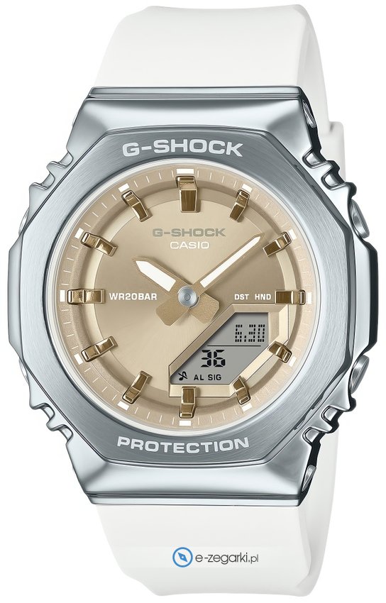 Zegarek damski GM-S2110-7A9ER marki Casio to idealne połączenie funkcjonalności i ciekawego designu. Model ten jest z serii Casio G-Shock. Wysokiej trwałości cyferblat zegarka pokryto złotym kolorem. Zegarek ten pokazuje aktualny czas w formacie analogowo - cyfrowym dzięki czemu odczyt jest bezproblemowy. Koperta w barwach koloru srebrnego szeroka jest na 40 mm oraz ma grubość 11 mm.