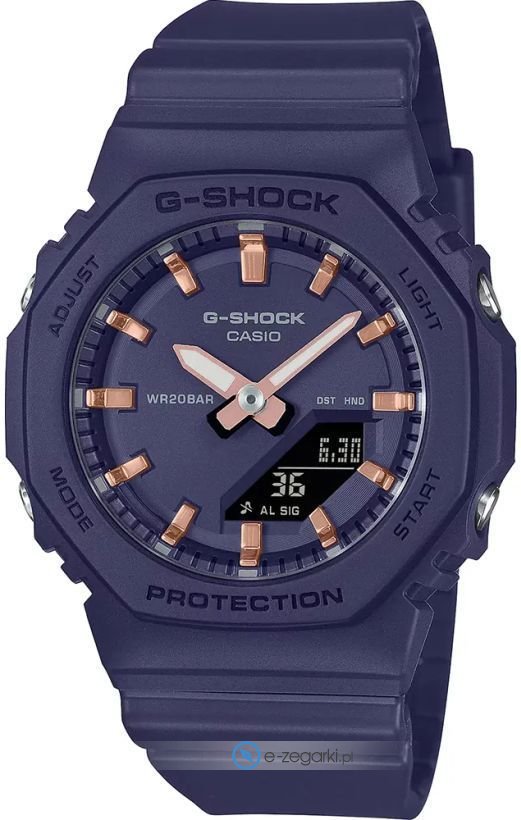 Model damski GMA-P2100M-2AER to propozycja z kolekcji Casio G-Shock, japońskiego producenta, który słynie z tworzenia zegarków o wysokiej wytrzymałości i funkcjonalności. Ten konkretny model charakteryzuje się niebanalną konstrukcją, którą podkreśla fioletowa tarcza. Analogowo-cyfrowy odczyt czasu zapewnia czytelność i szybkość odczytu. Koperta o szerokości 40 mm i grubości 11 mm ma okrągły kształt i również utrzymana jest w kolorze fioletowym.