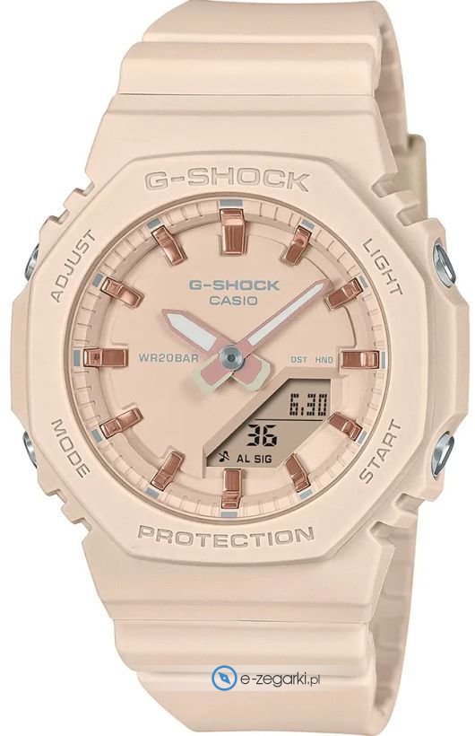 Zegarek GMA-P2100M-4AER posiada kwarcowy mechanizm zasilany standardową baterią. Pasek różowego koloru wykonany jest z wysokiej jakości tworzywa sztucznego.