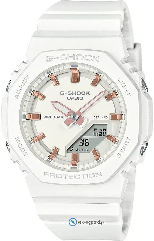 Zegarek damski GMA-P2100M-7AER marki Casio to idealne połączenie funkcjonalności oraz ciekawego designu. Model ten w gamie innych zegarków tego producenta występuje w serii Casio G-Shock. Niebanalny wygląd czasomierza osiągnięto m.in. poprzez cyferblat w kolorze białym. Godzina zaprezentowana jest w sposób analogowo - cyfrowy co intuicyjnie pozwala ją odczytać. Koperta jest w kolorze białym szeroka jest na 46 mm oraz ma grubość 46 mm - ma okrągły kształt.