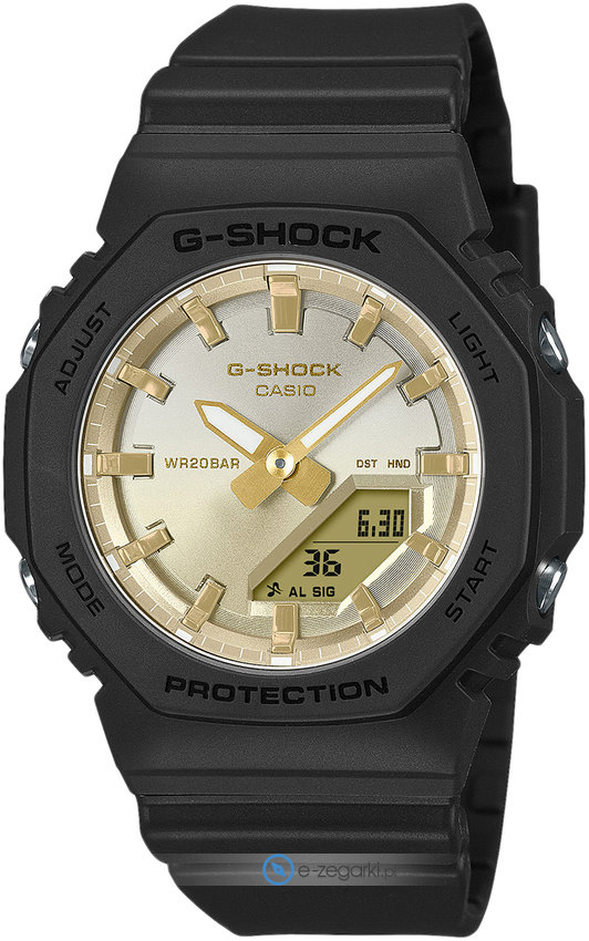 Zegarek damski GMA-P2100SG-1AER marki Casio to idealne połączenie funkcjonalności a także modnego designu. Model ten w gamie pozostałych zegarków tego producenta występuje w serii Casio G-Shock. Charakterystyczny wygląd zegarka uzyskano m.in. poprzez cyferblat w kolorze złotym. Pokazana metodą analogowo - cyfrową bieżąca godzina jest czytelna i prosta do sprawdzenia. Koperta jest ozdobiona kolorem czarnym szeroka jest na 40 mm oraz ma grubość 11 mm - ma okrągły kształt.