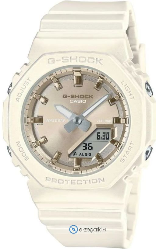 Zegarek GMA-P2100ST-7AER wyposażony jest w mechanizm zasilany tradycyjną baterią kwarcową. Pasek jest w kolorze beżowym zrobiony jest z wysokiej jakości tworzywa sztucznego.