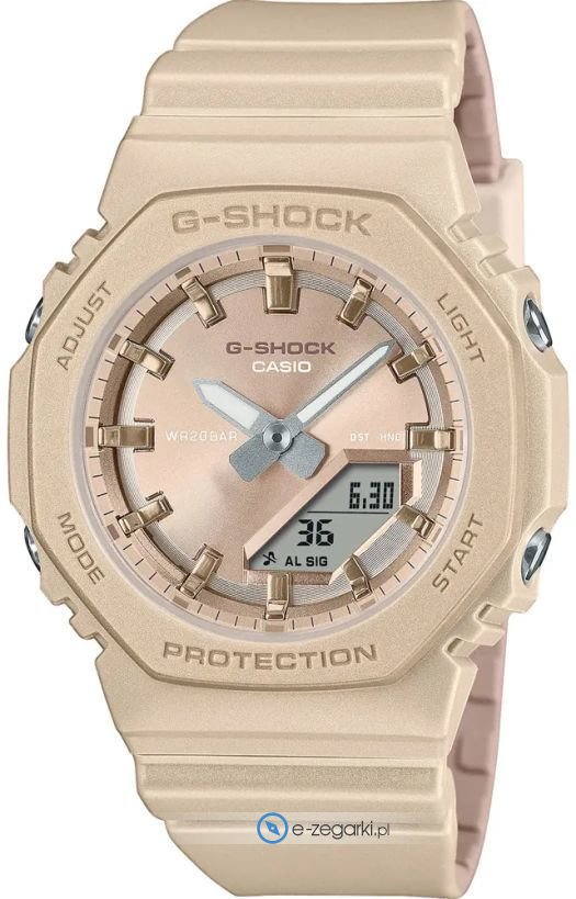 Casio GMA-P2100ST-9AER - damski zegarek kierowany dla osób szukających zegarka z rodziny Casio G-Shock. Atrakcyjną budowę zegarka uzyskano dzięki tarczy w kolorze beżowym. Zegarek ten pokazuje aktualny czas w formacie analogowo - cyfrowym dzięki temu odczyt jest bezproblemowy. Koperta jest w kolorze beżowym szeroka jest na 40 mm oraz ma grubość 11 mm.