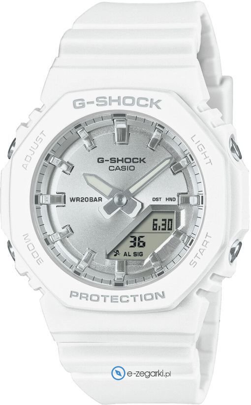 Zegarek GMA-P2100VA-7AER marki Casio to gustowny zegarek naręczny damski, który jest wyposażony w pomysłowe rozwiązania oraz funkcje. Model ten jest z serii Casio G-Shock. Ciekawy wygląd zegarka uzyskano także dzięki tarczy w kolorze srebrnym. Pokazana metodą analogowo - cyfrową bieżąca godzina jest czytelna i prosta do sprawdzenia. Koperta jest w kolorze białym szeroka jest na 40 mm oraz ma grubość 11 mm - posiada okrągły kształt.