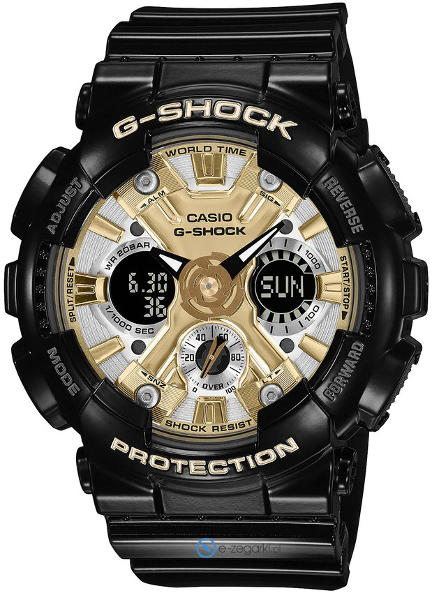 Zegarek GMA-S120GB-1AER marki Casio to stylowy zegarek naręczny damski, który jest wyposażony w ciekawe rozwiązania i funkcje. Model ten zalicza się do kolekcji Casio G-Shock. Charakter zapewnia wysokiej jakości cyferblat w kolorze złotym. Zegarek ten prezentuje aktualny czas w formacie analogowo - cyfrowym dzięki czemu odczyt jest bardzo łatwy. Koperta jest w kolorze czarnym szeroka jest na 46 mm oraz ma grubość 15 mm - ma okrągły kształt.