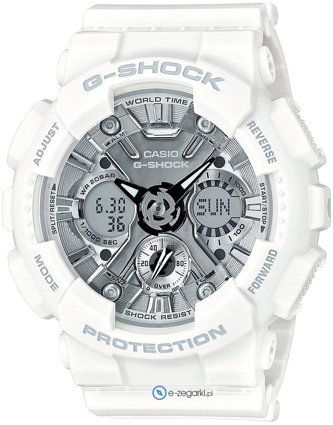 Zegarek damski GMA-S120MF-7A1ER marki Casio to stylowe połączenie funkcjonalności oraz modnego designu. Model ten jest z serii Casio G-Shock. Zegarek ten pokazuje aktualny czas w formacie analogowo - cyfrowym dzięki temu odczyt jest bezproblemowy. Koperta szeroka jest na 43 mm oraz ma grubość 15 mm.