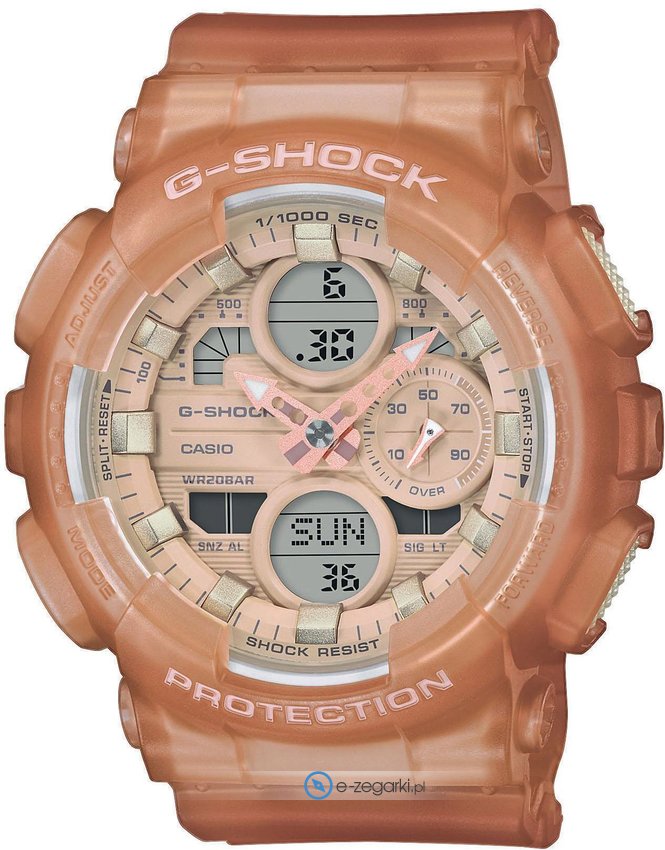 Zegarek damski GMA-S140NC-5A1ER marki Casio to stylowe połączenie funkcjonalności oraz ciekawego designu. Model ten w gamie innych zegarków tego producenta występuje w serii Casio G-Shock. Aktualna godzina przedstawiona jest w sposób analogowo - cyfrowy co niezmiernie łatwo pozwala ją odczytać. Koperta szeroka jest na 45.9 mm oraz ma grubość 15.8 mm - cechuje się okrągłym kształtem.