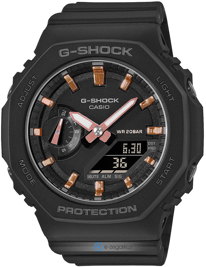 Zegarek damski GMA-S2100-1AER marki Casio to stylowe połączenie funkcjonalności oraz ciekawego wzornictwa. Model ten występuje w serii Casio G-Shock. Ciekawy wygląd zegarka osiągnięto także dzięki tarczy w kolorze czarnym. Zegarek ten pokazuje godzinę w formacie analogowo - cyfrowym dzięki czemu odczyt jest intuicyjny. Koperta została pokryta kolorem czarnym szeroka jest na 43 mm oraz ma grubość 11 mm - cechuje się okrągłym kształtem.