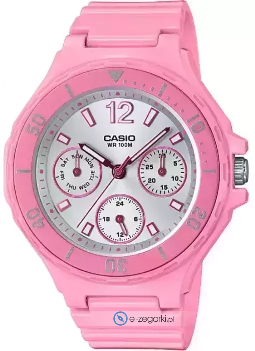 Zegarek LRW-250H-4A3 zasilany jest za pomocą baterii kwarcowej. Pasek jest w kolorze różowym wykonany jest z wysokiej jakości tworzywa sztucznego.