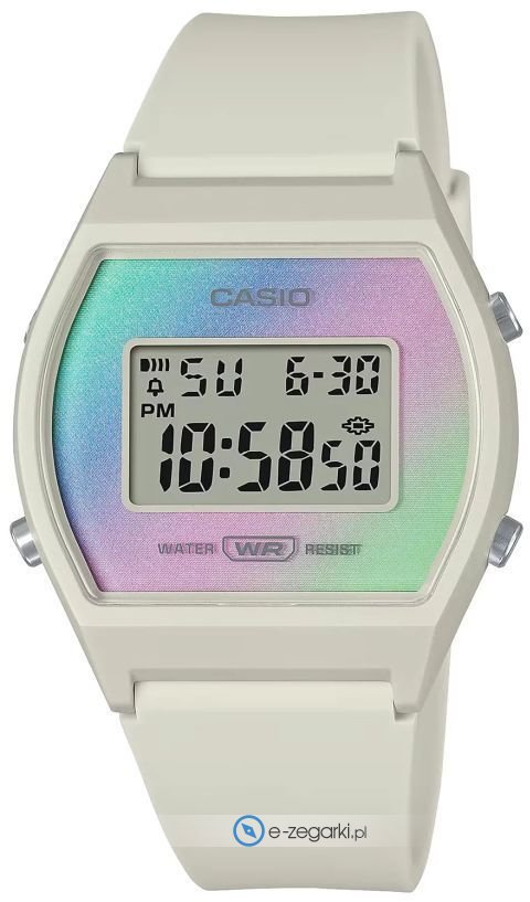 Zegarek damski LW-205H-8AEF marki Casio to dobre połączenie funkcjonalności i ciekawego wzornictwa. Aktualna godzina prezentowana jest w sposób cyfrowy co intuicyjnie pozwala ją odczytać. Koperta jest ozdobiona kolorem białym szeroka jest na 35 mm oraz ma grubość 10 mm.