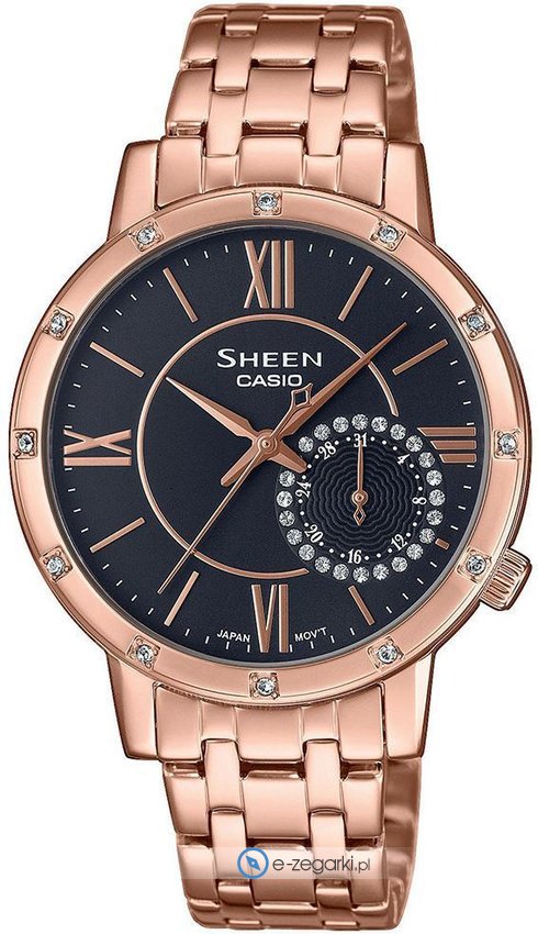 Zegarek damski SHE-3046PG-8AUER marki Casio to stylowe połączenie funkcjonalności a także modnego designu. Model ten jest z kolekcji Casio Sheen. Zegarek ten prezentuje godzinę w formacie analogowym dzięki temu odczyt jest bezproblemowy. Koperta szeroka jest na 34 mm oraz ma grubość 9.3 mm - posiada okrągły kształt.