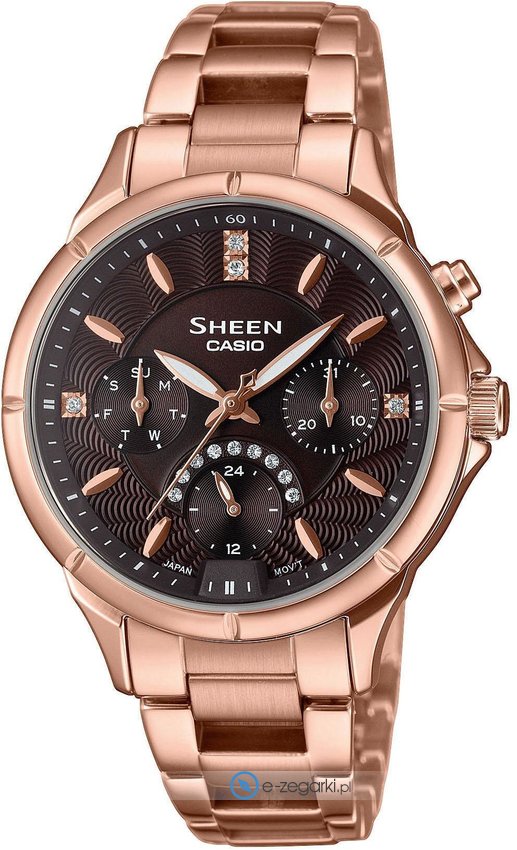 Zegarek damski SHE-3047PG-5AUER marki Casio to idealne połączenie funkcjonalności oraz modnego wzornictwa. Model ten należy do kolekcji Casio Sheen. Niebanalny wygląd czasomierza osiągnięto także dzięki tarczy w kolorze ciemnym. Godzina przedstawiona jest w sposób analogowy co intuicyjnie pozwala ją odczytać. Koperta szeroka jest na 35.3 mm oraz ma grubość 11.2 mm - posiada okrągły kształt.