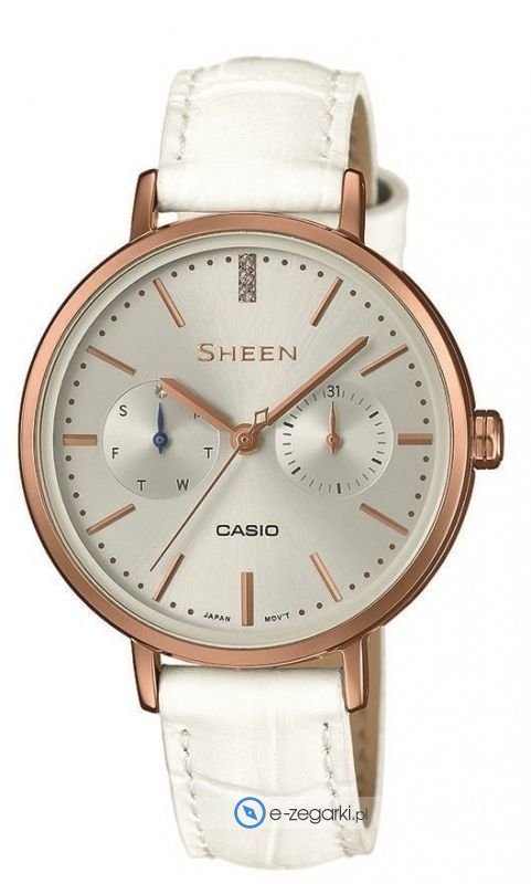 Zegarek SHE-3054PGL-7AUER zasilany jest za pomocą baterii kwarcowej. Pasek zrobiony jest z wysokiej jakości skóry zapewniającej trwałość i komfort noszenia.