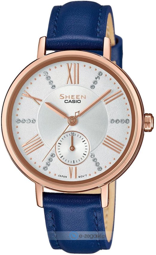 Zegarek SHE-3066PGL-7AUEF zasilany jest bateryjnie - ogniwo kwarcowe. Pasek koloru granatowego wykonany jest z wysokiej jakości skóry gwarantującej trwałość i wygodę noszenia.