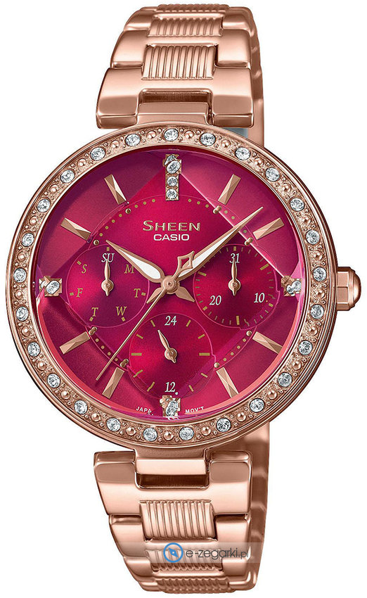 Zegarek damski SHE-3068PG-4BUER marki Casio to dobre połączenie funkcjonalności a także ciekawego designu. Model ten w gamie innych zegarków tego producenta występuje w serii Casio Sheen. Godzina przedstawiona jest w sposób analogowy co intuicyjnie pozwala ją odczytać. Koperta szeroka jest na 34 mm oraz ma grubość 10 mm - w kształcie okrągłym.